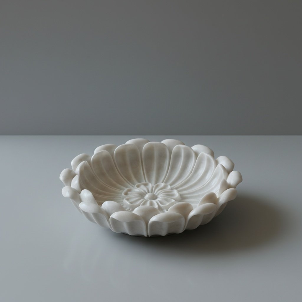 Sculpted from premium Makrana white marble and intricately hand-carved with a delicate floral motif, this decorative bowl brings timeless elegance to any space. The smooth stone surface and natural veining create a refined, one-of-a-kind statement—perfect as a coffee table centerpiece, entryway catchall, or styling accent for shelves and sideboards.